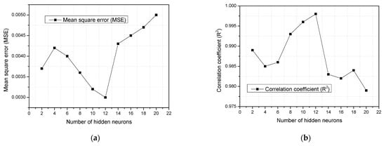 Variation of MSE and R2 with regard to the amount of hidden neurons: (a) mean square error (MSE); and (b) correlation coefficient (R2).