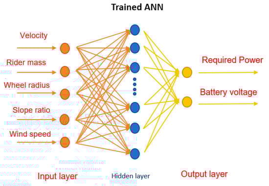 The development of the predicted model was performed in MATLAB 2021 software. It was preceded by selecting the optimal configuration that achieved the lowest mean squared error (MSE) and a robust correlation coefficient (R value). The Levenberg–Marquardt algorithm was employed to expedite the training process of the model. The experimental dataset was partitioned into three subsets: validation, testing, training data. These subsets encompassed 70%, 15%, and 15% of the total dataset. The artificial neural network (ANN) was designed with a basic structure comprising two input variables and three output variables, along with a single hidden layer. The key parameters included the wheel radius (Rw), the scooter velocity (V), wind speed (Vw), rider mass (Mr), and slope ratio (G), which were used as the input factors. The required power and battery voltage were used as the output parameters, as shown in Table 2. According to Table 2, the quantity of neurons for the input and output layer are 5 and 2, while the quantity of neurons for the hidden layer need to be optimized. To ascertain the ideal quantity of hidden neurons, a sensitivity analysis was conducted to examine the relationship between MSE and R2 values and the quantity of hidden neurons. The trained network model was utilized to assess the fluctuation of MSE with respect to the quantity of hidden neurons, which is shown in Figure 5. The largest correlation coefficient (R2) between the actual and predicted value during validation stage was 0.998 with 12 hidden neurons. The MSE was minimized (0.003) at 12 hidden neurons. The architecture of the ANN model used in this analysis was configured as 5-12-2, indicating 5 input neurons, 12 hidden neurons, and two output neurons, as shown Figure 6. This configuration yielded satisfactory results, as evidenced by the favorable fit observed in the regression plots.