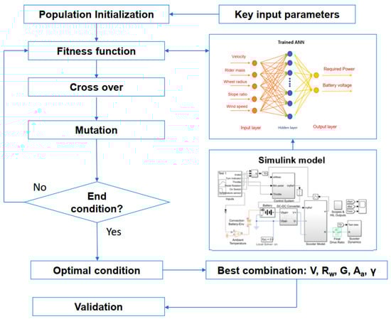 Research on electric scooter dynamics has been conducted. Chergui Hicham et al. conducted a study on the torque control of three-wheel electric scooter. The study applied a space vector modulation to control the torque of the wheel motor, which connects the scooter stability control system and energy storage system. The research results showed that the state of the battery can achieve more than 0.2% in 18 s [11]. Muhammad Nur Yuniarto et al. created an energy consumption model for an electric scooter. The study included various parameters such as scooter mass, scooter frontal areas, tire dimensions, and tire rolling resistance to estimate vehicle performance. The results demonstrated that the energy consumption prediction had errors of −8.63% and −4.7% when the experimental study was carried using a dynamometer and normal on-road testing [12]. In addition, Christina M.R. Garman et al. installed sensors on an electric scooter to measure acceleration, velocity, steering angle, and roll angle. The study evaluated accelerating, decelerating, turning, stopping, and unexpected braking events. Results showed that the e-scooter had a maximum lean angle of 59 degrees and a maximum lean rate of 783 deg/s [13]. Along with research about electric scooter performance, studies related to energy storage and battery charging to improve the flexible characteristics of electric scooters have been conducted. Jia-Sheng Hu et al. proposed a hybrid energy storage system using wireless power transfer for electric scooters to improve battery performance and extend the lifetime of the energy system. The study found that the efficiency of the overall system from the direct current source to the super capacity and battery is 86.4%, which was also confirmed by the experimental results [14]. Moreover, Paolo Di Giorgio et al. combined a battery pack and hydrogen tank to create a hybrid energy storage system that harnessed the endothermic nature of hydrogen desorption in metal hydrides to passively control the temperature of the battery [15]. Many studies have been carried out to investigate the charging of shared electric scooters. Rui Zhu et al. proposed a solar integrated charging station, with a real time shareability network to address the issue of shared e-scooters. By optimizing the PV size-reservation time, the system requires only a small percentage of the initial charging trips and PV modules (1–3 m2) to serve nearly 100% of user trips [16]. Alberto Martínez-Navarro et al. presented a stand-alone PV system as an ES recharging dock. The experimental test showed that the ES recharging dock provided additional autonomy with a distance of 31.2 km [17]. Moreover, to improve charging efficiency for solar charging system, Fatih Issi et al. proposed a class-e inverter for solar charging systems. However, the inverter output voltage varied with changes in the number of e-scooters being charged and a PID controller was used to keep the inverter output load voltage constant [18]. Furthermore, Muhammad Awais et al. presented an environmental impact study of a solar-powered charging station for electric scooters, demonstrating that the station can limit CO2 emissions by nearly 1154.21 kg/year [19]. A brief summary of studies in the area of electric scooters include approaches to improving stability control, energy consumption, acceleration, braking, the use of solar power transfer to enhance battery performance and extend the lifetime of energy systems, and environmental aspects such as limiting CO2 emissions. However, very few studies have considered the performance of electric scooters and methods to improve performance. This paper applies an ANN-GA method that used prediction and optimization to determine optimal performance for electric scooters. The ANN_GA method was used to predict and enhance the power demand and energy consumption of electric scooters under various operating and structure parameters.