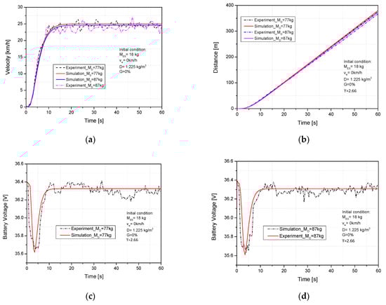 (a) Velocity validation versus rider mass; (b) travel distance validation versus rider mass; and (c,d) battery voltage validation versus rider mass.