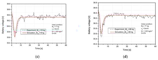 The experiments were carried out to provide basic ES performance data, which were validated with the simulation study. Figure 9 and Figure 10 show the comparison between the output data of the simulation and experiment. The straight lines describe the simulated results while the segmented line describes the experimental results. The rider mass was adjusted from 77 kg to 87 kg to evaluate the performance of the ES during moving conditions. Figure 9a presents the maximum difference of scooter velocity, which is 8.25% at 25 s. The scooter velocity is an experimental average value and is thus acceptable. When the wind speed, slope grade, wheel radius and ES mass are kept at a constant, the scooter velocity reduces with the increase in rider weight. Figure 9b–d show the validated moving distance and battery voltage. The same trend can be seen in the simulation and experimental values. The maximum difference in the moving distance and battery voltage are 3.53% at 56 s and 0.4% at 28.5 s, respectively.