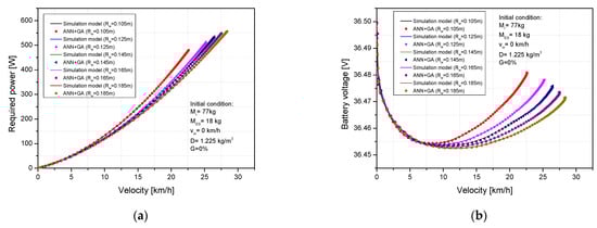 Comparison between the simulated and ANN-GA predicted results of (a) power demand-velocity, (b) battery voltage-velocity curve under varying wheel radius.