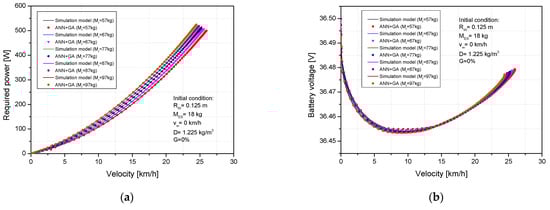 Comparison between the simulated and ANN-GA predicted results of (a) power demand-velocity, (b) battery voltage-velocity curve under varying rider weight.