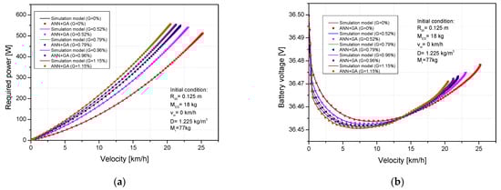 Comparison between the simulated and ANN-GA predicted results of: (a) power demand–velocity; and (b) battery voltage–velocity curve under varying slope ratios.