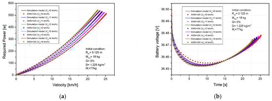 Comparison between the simulated and ANN-GA predicted results of: (a) power demand–velocity; and (b) battery voltage–velocity curve under varying wind velocities.