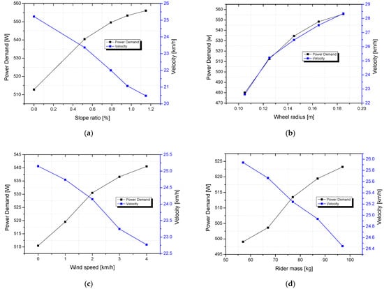 The slope grade has a sensitive influence to required power and battery voltage of ES during operation. As observed in Figure 13a the power demand increased when the slope grade rose. This is because the increase in required power was due to an increased slope resistance force, that will make a larger total resistance force. Therefore, the power to scooter overcome will be greater. As a result, when the slope grade rose from 0% to 1.15%, the demanded power rose from 510.2 to 554.3 W and the highest velocity dropped from 25.1 to 20.4 km/h, beside that, the highest difference between simulated results and predicted results was 4.2% at 2.4 km/h with slope grade of 1.15%. Figure 13b presents the effect of slope grade on battery voltage. It is evident that as the slope grade increases, the battery voltage lowers. This is also congruent with the basic principles behind ES operation: as the slope resistance force increases, so does the energy consumption. This explains why the voltage of battery decreased 0.02% when slope grade rose from 0% to 1.15%.