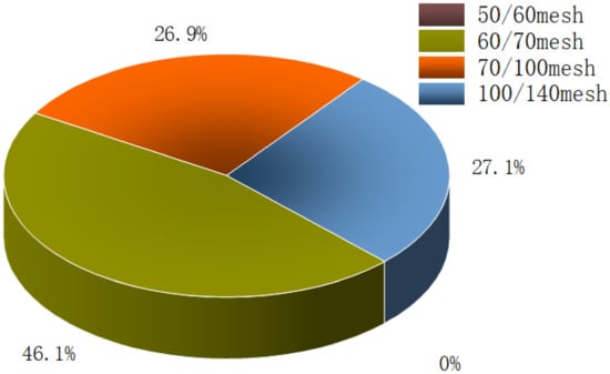 During the field hydraulic fracturing operation, large-sized sand was used to support the main fractures, while small-sized sand was used to support microfractures. In this study, 50/140 mesh quartz sand was used, like ones applied in the field. As observed in the Figure 1, sand of 60/70 mesh accounts for nearly half of the distribution, while 70/100 mesh and 100–140 mesh sand accounts for approximately one-fourth.