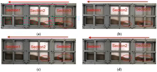 Sand-carrying ability with a different horizontal flow rate in rough fractures (0.4 wt.% emulsion concentration of conventional slickwater; 10% sand ratio). (a) 21 m/min; (b) 16 m/min; (c) 12 m/min; (d) 8 m/min. Arrow is the injection direction.