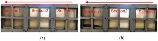 Figure 4 shows the sand settling of 70/140 mesh quartz sand, with a sand concentration of 10%, within a rough fracture when the slurry viscosity is 10 mPa·s. The pump was stopped for 28 s to observe the settling. Before stopping pumping, the liquid flowed from section 3 to section 1 at a velocity of 18 m/min.