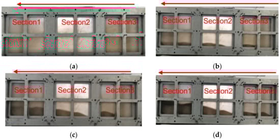 The experimental conditions were the same as those of the sand-carrying experiment, with different flow rates used to observe sand-carrying ability. From Figure 7, it can be observed that there is a significant difference in the settling height of the sand banks under different flow velocities. There were no sand banks that appeared at a flow velocity of 21 m/min (as shown in Figure 7a). As the flow rate decreased, sand banks gradually appeared. When the flow rate dropped to 8 m/min (as shown in Figure 7d), the sand banks in different locations settled rapidly and the sand settling rate increased. The sand settled as soon as it entered the rough fracture, indicating bad sand-carrying ability in this flow rate. Although the flow velocity can carry sand, the sand-carrying ability is extremely poor below a certain flow velocity.
