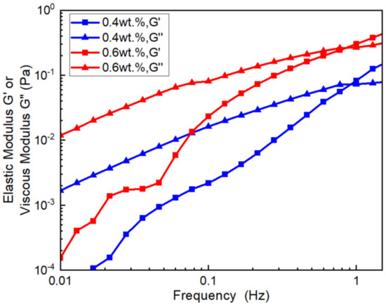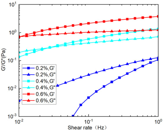 When subjected to external forces, viscoelasticity is the strain response of a material under shear stress. A bigger elastic modulus indicates that it is harder to cause deformation under shear stress. The relaxation time, which is the time required for the material to return to its equilibrium state, is the reciprocal of the frequency [22]. It is generally believed that a longer relaxation time or lower frequency represents a better sand-carrying ability. The elastic modulus, known as the storage modulus, is represented by G′, while the viscous modulus, known as the loss modulus, is represented by G″. When G′ is greater than G″, elasticity begins to dominate, indicating a significant improvement in the strength of the structure as compared to before.