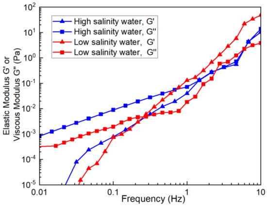 Figure 10 shows the two types of slickwater prepared using high salinity water and tap water separately. This experiment involved preparing viscous slickwater at two different mineralization levels. By adding different concentrations of viscous slickwater to water with different mineralization levels, the aim is to achieve the same viscosity. The cross point of G′ and G″ for the viscous slickwater prepared with tap water was at 0.2783 Hz, while the cross point for the slickwater prepared with high salinity water was at 1.468 Hz. The frequency at the cross point increased by 5.27 times.