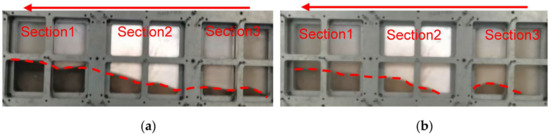 For the experiment, solution A, the slurry with a high elastic modulus and viscous modulus, and solution B, the slurry with a low elastic modulus and viscous modulus, were used. The sand ratio for the experiment was 10% and the flow velocity was set at 12 m/min. In section 1, the equilibrium height of the sand bank in solution B was measured to be 15 cm (as shown in Figure 13a), while in solution A, it was measured to be 13 cm (as shown in Figure 13b). In section 2, the height of the sand bank in solution B was not only significantly higher than that of solution A, but its leading edge was also closer to section 3. In section 3, although the sand bank of solution A was higher than that of solution B in some areas, solution B had a larger sand-covered area. Overall, solution B had a higher equilibrium sand bank height and a larger sand bank area.