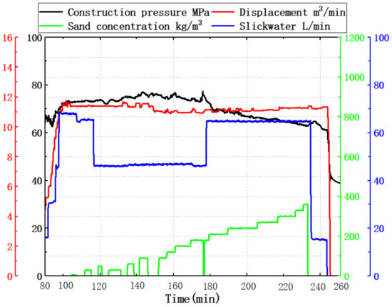 To upscale the laboratory findings and field tests, the operations are conducted under two kinds of conditions. The first condition is a 0.6 wt.% slickwater concentration, a maximum sand concentration of 360 kg/m3 (corresponding to a sand ratio of 24%), and a displacement rate of 11.07 m3/min. The second condition is a 0.4 wt.% emulsion concentration, a maximum sand concentration of 180 kg/m3 (sand ratio of 12%), and an operation displacement rate of 11.07 m3/min. No sand blockage occurred during the sand addition process. The operation parameters are shown in Figure 15.