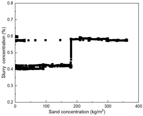 Slickwater concentration corresponding to different sand concentrations during field operation at a displacement rate of 11.07 m3/min.