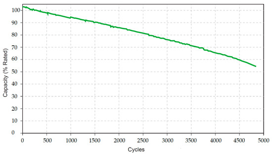 where ΔT is the temperature difference between the battery cell and the ambient (Tcell − Tamp), Ibatt is the battery input current, and Vbatt is the battery output voltage. The constants of Equation (4) are defined and evaluated in Table 4. The battery circuit model considers the fading capacity effect by adding resistance in series (Rcyc). It is identified in [42], as shown in Equation (5), as a function of the number of charging and discharging cycles (ncyc). The usable battery capacity (Cusable) is a function of ncyc and temperature [43]. Figure 5 shows the percentage of Cusable from the initial capacity (C0) over the ncyc and at a reference ambient temperature of 23 °C. A simple definition for the change in SOC is made by Equation (6) [42], where SOC0 is the initial state of charge.