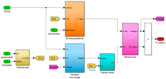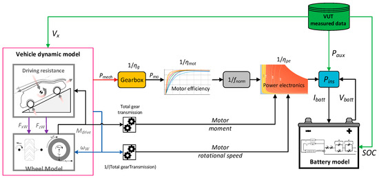 The complete model of the VUT is shown in Figure 11. The main gain of this model is its ability to estimate the total battery power for the assigned maneuver based on two input variables: the relevant speed profile (Vx) and auxiliary power (Paux). Based on the speed profile, the corresponding physical quantities are determined from a simulation model for the VUT. Then, the mechanical power (Pmech) can be estimated using Equation (15) [45].