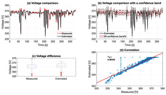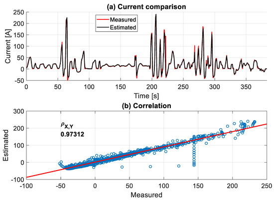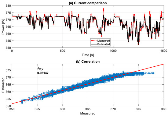 The battery voltage model is already validated in [33]. However, all test maneuvers were performed with relatively low speeds and short testing periods due to the limited area of the testing site. Therefore, the VUT in this work underwent a WLTP class two (WLTP2) driving cycle on a roller dynamometer test bench to validate the model for higher speeds and a more extended test period. Figure 12 displays that the battery model estimated the total battery-pack output voltage, corresponding to the measured battery current, with a high Pearson correlation coefficient (Pearson correlation coefficient—Wikipedia, https://en.wikipedia.org/wiki/Pearson_correlation_coefficient#cite_note-3, accessed on 27 November 2023) of 0.981.