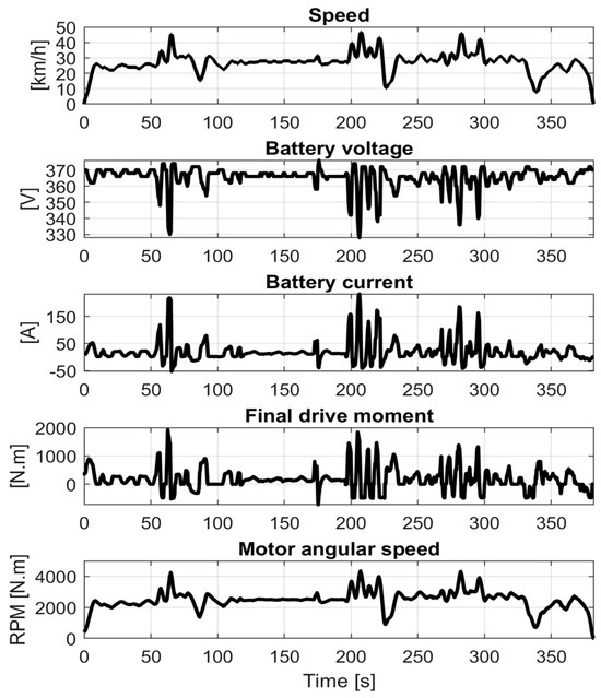 The battery pack of the VUT contains 19 battery modules. Each module encompasses six cell blocks that are connected in series. Every cell is made of 50 LiFePO4–graphite cells connected in parallel. The total number of cells within the single battery module is 300 [32]. The battery module specifications are given in Table 2. The VUT provides battery cell units of cathode lithium iron phosphate (LiFePO4). These cells are distinguished by their open-circuit voltage curves that remain almost constant over the SOC range from 20% to 80%, even at different ambient temperatures [32]. The same model developed in [32], which accurately simulates the changes in the battery during dynamic maneuvers, will also be employed in this work. The battery model requires the following inputs: the battery current, the SOC signal, the corresponding capacity rates (C-rate), the ambient and battery temperatures, and the number of charging and discharging cycles.
