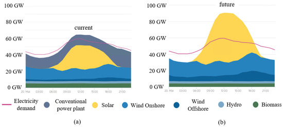 Current electricity generation in Germany and future generation with an 80% renewable share [1].