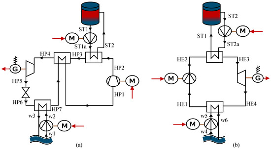 In the charging process, excess electrical energy is used to compress the working fluid to achieve supercritical pressure (HP1–HP2). The heat is then transferred to the TES (HP2–HP3). The working fluid is further cooled in the recuperator (HP3–HP4) until the temperature falls below the critical temperature. The working fluid is initially expanded in a liquid expander to a state close to saturation (HP4–HP5) before being further expanded through a throttle to reach the evaporating pressure (HP5-HP6). Within the heat exchanger (HP6–HP7), the working fluid evaporates from heat supplied by river water and undergoes additional heating within the regenerative heat exchanger (HP7–HP1). This HP process is depicted in Figure 3a.