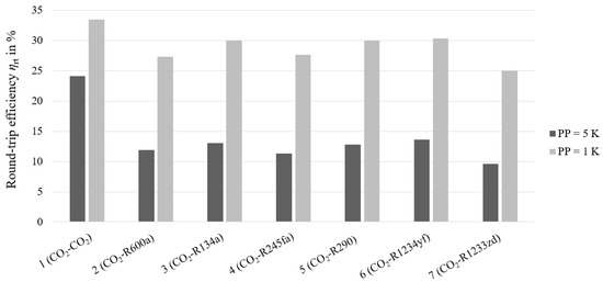 Figure 4 presents an overview of the simulation results for the different configurations with two different PPs. The best round-trip efficiency at a PP of 5 K is achieved by the transcritical discharge process (Configuration 1), while the other configurations with the operational organic Rankine cycle (ORC) fluids have efficiencies between 9.6% and 13.7%. Overall, a reduction in PP generally leads to an increase in the round-trip efficiency, likely due to the increase in evaporation pressure and decrease in condensation pressure during discharge. In Configuration 1 (–), the round-trip efficiency increases from 24.15% to 33.48%. Comparatively, Configurations 2 to 6 now exhibit notably higher increases in round-trip efficiencies compared to the 5 K PP.