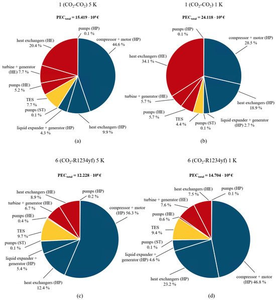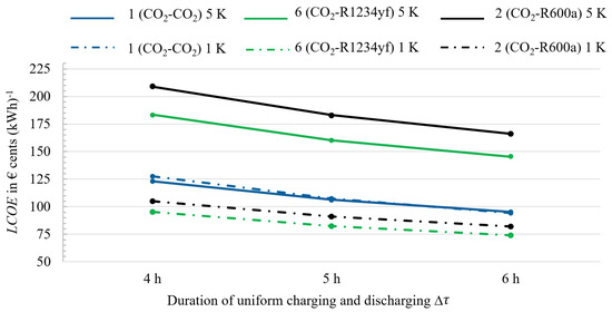 Figure 6 shows the LCOEs for CBs with , R1234yf and isobutane depending on the hours of discharge and the PP. The numerical values mentioned in the following regarding PEC and LCOE for the different configurations can be found in Table A4, Table A5, Table A6 and Table A7. The average total PEC for the subcritical processes of configurations 2, 3, 5, 6 is EUR 12.212 . Configuration 1, based on the HE, has PECs of about EUR 3 million higher than the others. However, Configuration 1 has the lowest LCOE (EUR 1.23 ). Because of their lower round-trip efficiencies, the other configurations range from EUR 1.84 to EUR 2.09 . With a reduced PP, Configuration 1’s component costs increase by over 56%, while those for the other configurations are only 20% more on average (see Table A5). In addition, a higher LCOE for Configuration 1 is obtained. The principal reason behind the escalated costs for the heat exchangers is the temperature differences within the HE, specifically from the hot TES to the discharging process. The reduction in PP has a positive effect on the LCOE of the other configurations, leading to an average reduction of 53.8%. The data presented in Table A6 and Table A7 show that the assumption of uniform charging and discharging times of 5 and 6 h, respectively, leads to a further reduction in the LCOE. Although the expansion of the two-zone storage system is associated with additional costs, they do not have a major impact on the total PEC or LCOE, as shown in Table A6 and Table A7. The increase in is due to the additional hours necessary for the charging process. As the timeslots with the lowest prices are chosen first for the charging process, additional hours necessary are accompanied by higher prices for these hours, resulting in higher prices on average. In addition, Figure 7 compares the shares of the PECs of the different components for Configurations 1 () and 6 (R1234yf) with different PPs. The sub-processes of charging, storage, and discharging are presented in different colors. In all configurations, the compressor (including the motor) is the most cost-intensive component. However, if the PP decreases, the cost share of the heat exchanger increases. The PEC distributions for the remaining configurations are similar to those for Configuration 6.