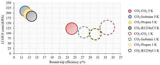 Figure 8 presents a comprehensive and compact comparison of the various configurations. The bubble chart shows the round-trip efficiency and LCOE of CBs with , isobutane, propane, and R1234yf for the two investigated PPs. Additionally, the PEC of each configuration is visualized by the size of the respective bubble. The increases in PEC and efficiency by lowering the PP are clearly recognizable. Except for Configuration 1, the LCOEs decrease for all configurations when the PP is reduced.