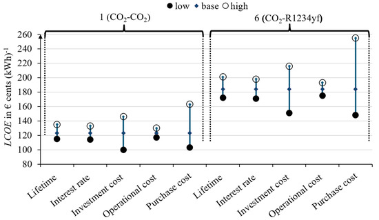 To identify the parameters with the greatest impact on the LCOE, a sensitivity analysis was carried out. Figure 9 shows the results for Configurations 1 and 6 with a PP of 5 K and a duration for the discharging process of 4 h. Table A8 lists the parameters and their variations for the sensitivity analysis. The results of only Configurations 1 and 6 are presented in this work because the latter is representative of the other organic working fluids. The configurations are comparably sensitive to the same parameters, and only the absolute values differ between the configurations. Al though Configuration 1 has higher total PECs and a relative variation of a parameter can be assumed to be more influential, the higher round-trip efficiency overcompensates this effect. This connection is also why the LCOEs of Configuration 1 are lower than those of the other configurations for a PP of 5 K. A rise in the purchase cost of electricity increases the LCOE the most. The values used to vary the purchase cost of electricity are the lower and upper limits of the years 2020 and 2022, respectively. The second most influential factor on the LCOE is the investment costs. As the deviation in the investment costs is the same for the upper and lower limits, the results of the sensitivity analysis are evenly distributed compared to the base case, unlike the analysis results of the purchase cost of electricity. Further uneven influences occur by changing the period and debt interest rate. As the estimation of the LCOE is subject to great uncertainties, the results obtained can only be used for a qualitative comparison rather than evaluating the economic viability.