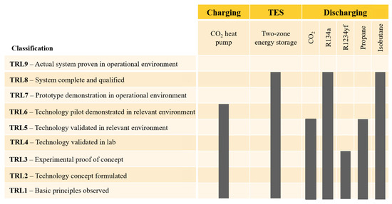 - The discharge process was experimentally investigated in [40], resulting in a minimum TRL of 3. A commercial system employing a supercritical process with high-temperature heat input is offered by one manufacturer [41]. However, this study utilized a lower heat input temperature of 115 . As a result, the subprocess is allocated a TRL of 5, requiring additional testing and development under operational conditions to reach a TRL of 6.