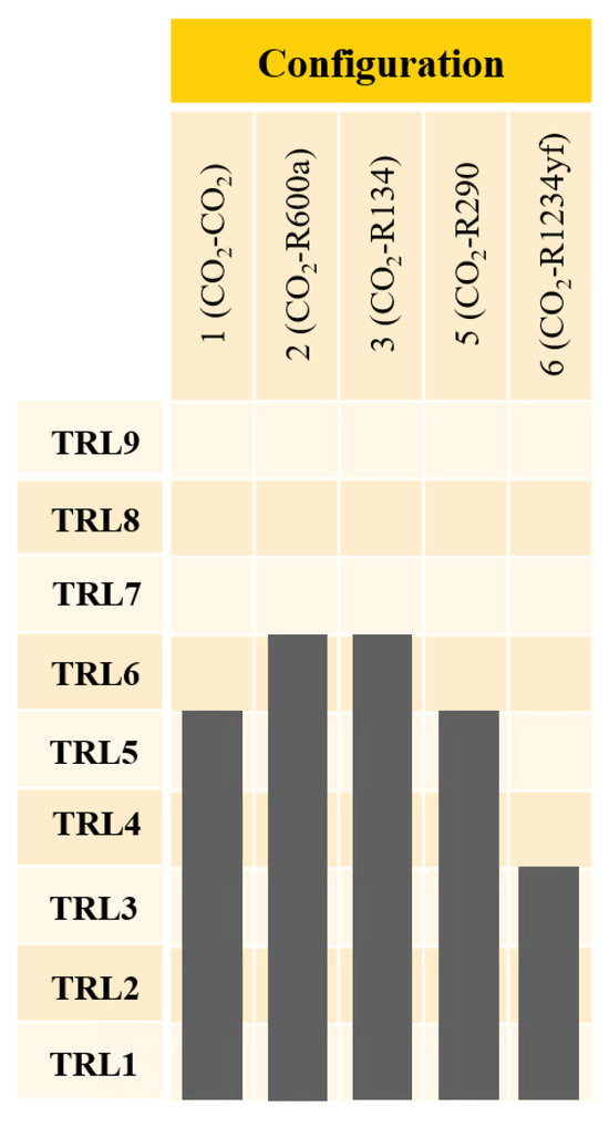 The TRL of the overall processes is equal to the lowest TRL resulting from the subprocesses. Configurations 2 with R600a and 3 with R134a reach the highest TRL of 6. The lowest TRL of 3 is obtained by Configuration 6 with R1234yf. An overview of the TRL of each configuration is given in Figure 11.