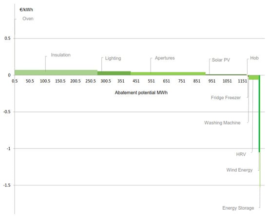 The findings of the analyzed systems are presented in Figure 2, which provides a Marginal Abatement Cost (MAC) Chart []. Each bar’s width represents the total reduction in or generation of potential electrical energy for each potential measure if prompt action is taken. Each bar’s height represents the cost, in euros, of avoiding each kilowatt hour. The bars that are depicted negatively signify the cost incurred for each kilowatt hour (kWh) that is either mitigated or generated. Conversely, the bars that are depicted positively signify the gain that is obtained for each kilowatt hour (kWh) that is either mitigated or generated during the relevant system’s lifetime.