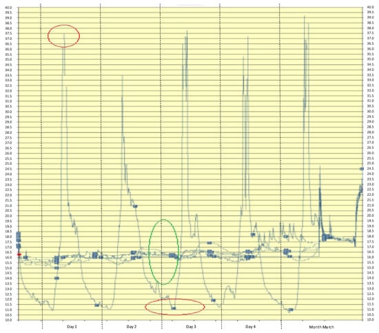 The building physics of the household under study provides advantages for implementing a passive house methodology. This study aims to evaluate the impact of additional building systems, specifically insulation and windows. Log Tag analyzers were deployed for a duration of time within the residential premises. The aforementioned analyzers can quantify both temperature and relative humidity parameters. The study was carried out utilizing six strategically distributed recorders in bedrooms, the living room, and at every level of the three-story household, plus at a higher level close to the roof, with an additional recorder positioned externally to monitor ambient temperature. During the experimental period, the activity observed within the household was of a family of five persons with an annual electrical consumption of about 7000 kWh. Polyurethane boards, with a thickness of 25 mm, were installed on a single-leaf masonry wall that is 180 mm thick. This installation was carried out on the rear side of the house, facing west. Beforehand, the roof lacked insulation and was constructed with “deffun” material, which has a calculated U-value of 1.52 W/m2K. This value falls within the acceptable range outlined in Document F of the EPC guidance. By implementing insulating boards and external protection, the fabric U-value of the single-leaf masonry wall was enhanced from 2.645 W/m2K to 0.725 W/m2K, as determined by the conducted calculations. Figure 4 comprises multiple charts of the recorders’ readings, indicating fluctuations in temperature. The red circles indicate the maximum and minimum external temperatures, whereas the green circle represents the internal temperatures with an average of around 17 °C. The outdoor temperatures reached a maximum of 38 °C and a minimum of 10 °C. The experimental findings indicate that despite the low level of activity within the house during the observation period, the indoor temperatures remained consistently comfortable without the aid of any mechanical systems, both during the day and at night. It was observed that the house was able to attain the optimal temperature range of 18–20 °C, as stipulated by ASHRAE 1997 Fundamentals, with minimal activity.