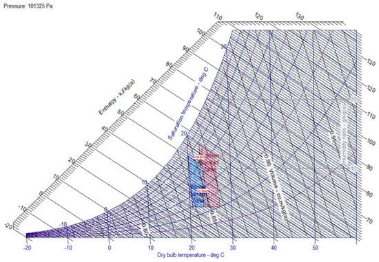 The AZ 8857 infrared Psychrometer, AZ Instrument, Taichung, Taiwan, was utilized to plot the temperature levels of the house. The dry bulb and wet bulb temperatures were recorded and plotted onto the recommended comfort levels, as illustrated in Figure 6. The psychometric chart was utilized to plot the values, which corresponded to the pressure of 0.1 MPa at an altitude of 36 m above sea level. Figure 6 displays the blue and red sections that indicate the range of temperature within which comfort can be achieved. The recorded data within the townhouse indicates that the two red points represent the dry bulb and wet bulb temperatures, which fall within the acceptable range of comfortable temperatures.
