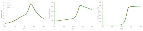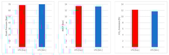 In this study, three parameters—maximum pressure, indicated mean effective pressure (IMEP), and CO2—were compared between the experimental and simulation results to verify the accuracy and reliability of the simulation LPG model. This aimed to use the validated simulation LPG engine to assess the exhaust emissions comparison with gasoline and diesel engines. NO emissions were excluded from the parameters because of the three-way catalyst device installed at the rear of the experimental engine exhaust. The results of the validation are shown in Figure 3 by comparing the experimental and simulation outcomes.