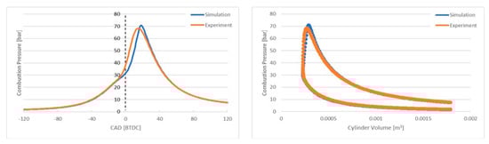 The comparison results show deviations of 3.6%, 0.7%, and 4.3% in the maximum pressure, IMEP, and CO2 emissions, respectively. In addition, the overall operating state of the simulated LPG engine was verified using the P–θ and P–V diagrams. Figure 4 compares the P–θ and P–V diagrams of simulation and experiment.