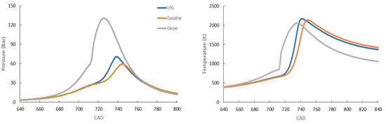 Since an engine’s emission is affected by cylinder pressure and temperature, comparing the cylinder pressure and temperature of each engine can be important prior to comparing the emission results. Figure 6 presents the comparison of cylinder pressure and temperature of LPG, gasoline, and diesel engines at the same output.