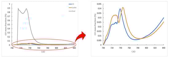 To assess the eco-friendliness of LPG engines, the CO2, CO, NO, and soot emissions of the simulation LPG, gasoline, and diesel engines were compared under the same output conditions. Table 9 presents the output (100% load), fuel consumption, mean mass per cycle of each engine, emission mass fraction of each engine, and the amount of emission in g/kWh of each engine.
