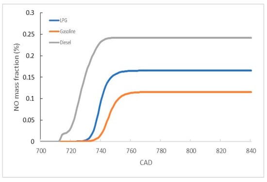 Figure 9 presents a comparison of NO emissions at the same output for the LPG, gasoline, and diesel engines.