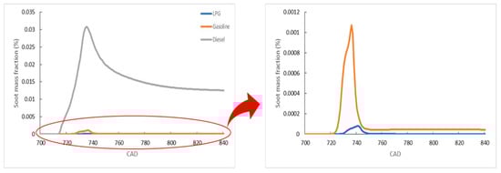 Figure 10 compares soot emissions at the same output from the LPG, gasoline, and diesel engines.