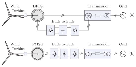Some reviews about frequency control support by wind energy conversion systems have already been published [29,30,31,32,33,34]. This paper diverges from previous reviews and focuses on strategies to improve frequency stability independent of grid frequency deviation or rate of change. Grid frequency information is employed solely for control triggering, and any anomalous event can be detected using a PLL or a dedicated event detector [35]. Commonly known as fast power reserve, this control technique can be implemented in both Type III and Type-IV wind energy conversion systems (illustrated in Figure 1a,b). In a Type-III WECS, the wind turbine is connected to a Doubly Fed Induction Generator (DFIG), which is connected directly to the grid in the stator and through a back-to-back converter in the rotor. This system can partially vary the rotor speed (), and the power converter is rated at () of the generator power. Type-IV WECS typically employs a PMSG, with its stator connected to the grid through a power converter to decouple the generator and grid sides. This system requires full-scale power processing by the converter and can vary the rotor speed from zero to the rated speed () [23].
