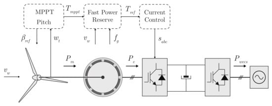 This paper focuses on Type-IV wind energy conversion systems as the basis for the analysis due to their prevalence in new installations [19] and the wide range of possible rotor operating speeds. A simplified control scheme for the wind generator with fast power reserve is illustrated in Figure 2, where the wind turbine, PMSG, and power converter are represented along the control loops. In steady-state operation, the wind turbine is controlled by the MPPT control in the medium wind region and by the pitch control in the high wind region. In this case, the torque reference from the MPPT () is limited to the rated power. The references of these controllers are combined with the fast power-reserve control reference, resulting in the generator torque reference . Subsequently, the generator current is controlled to obtain the reference torque. For the analyses presented in this review, both the current control and the power converter dynamics are neglected due to their significantly faster dynamics compared to the mechanical dynamics of the wind turbine and generator. Although a Type-IV WECS is considered, the results can be extended to Type-III WECS by limiting the maximum rotor speed variation, typically to .