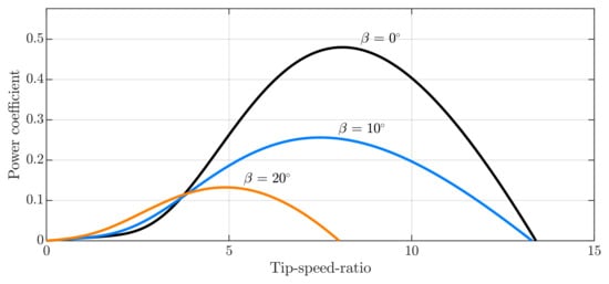 Power coefficient as a function of the tip–speed ratio for various blade pitch angles. Black curve: ; blue curve: ; and orange curve: .