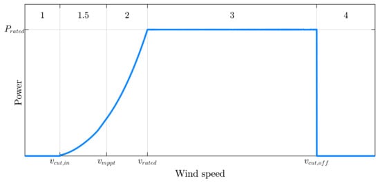 The power curve of the wind turbine as a function of wind speed in steady state is depicted in Figure 4. It can be characterized in four main regions of operation. In Region 1 (), the turbine is turned off because it cannot produce meaningful energy at low wind speeds. Region 1.5 () defines an operation with a fixed minimum angular speed, determined by mechanical resonance issues, where the pitch angle can be non-null to increase the generated power. Region 2 () is characterized by a variable rotor speed to obtain the maximum power coefficient and, consequently, maximum available power at a null pitch angle. In Region 3 () the turbine operates with rated rotor speed while limiting the generated power by increasing the blade pitch angle to prevent mechanical damage and overheating of the generator and power converters. In Region 4 (), the turbine is turned off to avoid high mechanical loads due to high wind speeds [42].