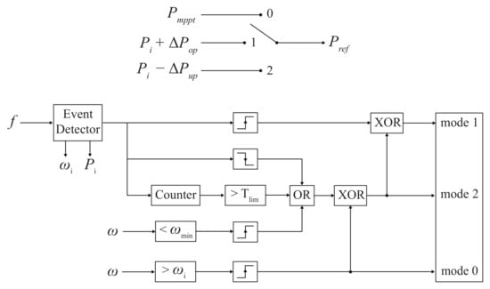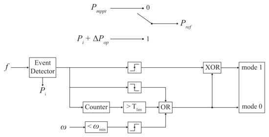 Control scheme of the implemented method based on [50]. Mode 0: MPPT and Underproduction; Mode 1: Overproduction.