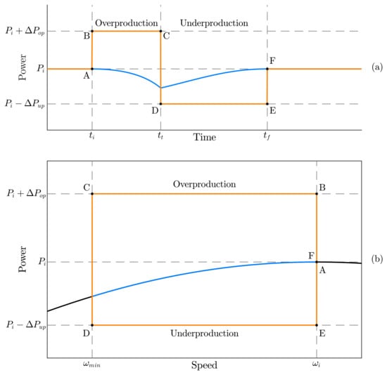 Overproduction () and underproduction () power references for the speed-based functions aimed at releasing additional power and restoring the rotor speed, respectively.
