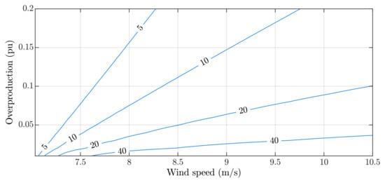 This equation demonstrates that the total overproduction duration depends on the system’s initial conditions and the generator power reference. Additionally, the duration is proportional to the equivalent inertia of the turbine, shaft, and generator. Figure 7 displays contour lines representing the maximum overproduction duration computed from (10) as a function of wind speed and overproduction power step . Each line indicates the combination of both variables, resulting in the same overproduction duration. From the grid’s perspective, a longer overproduction duration is desirable, allowing sufficient time for conventional generators to increase their production and compensate for the power imbalance in the system. As expected, operation at higher wind speeds is associated with a greater capacity to deliver additional energy for a longer period.