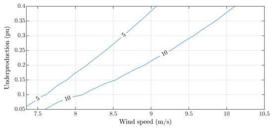 here, the generator power is constant and predetermined. Figure 8 depicts contour lines representing the underproduction duration as a function of wind speed and underproduction power . These lines illustrate the combinations of variables resulting in the same underproduction duration of 5 and 10 s. From the turbine perspective, a fast recovery with a high power reduction would be optimal for returning to MPPT operation. However, from the grid perspective, a high power reduction is undesirable, as it could potentially lead to a new frequency dip in the grid, necessitating an external power source to compensate for the power deviation. It is noteworthy that the recovery time increases with wind speed (due to the optimum angular speed) and decreases with a higher underproduction power reference. As the speed restoration is faster with a higher power deficit, a trade-off exists between the dynamic recovery of the wind turbine and the reduction in delivered power.