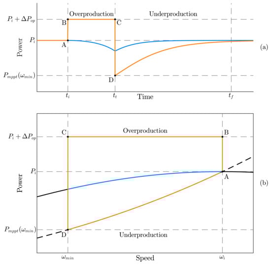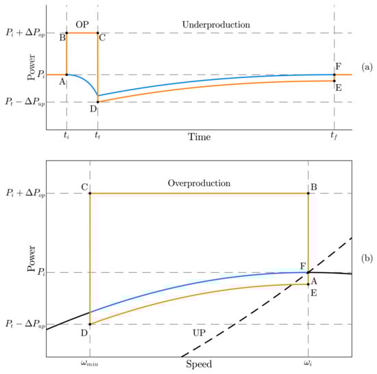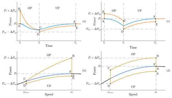 A sloped transition between stages is proposed by [49] and the correspondent mechanical and electrical powers as functions of time and speed are illustrated in Figure 14a,b, building upon the concept from [46] of constant OP and UP power references. In the overproduction mode, there is initially a constant power reference (points B,C). Afterward, the paper suggests a sloped transition between the two stages (points C,D) to avoid the steep power variation that causes second-frequency dips, and then the underproduction mode is set as a constant power until the MPPT power reference becomes higher (points D,E). In this case, four parameters can be configured for the dynamic performance, namely the additional OP and UP power reference ( and ), the duration of the OP mode from B to C, and the transition period from C to D. It is crucial to note that, in this scenario, the rotor speed should not reach the minimum speed before , as additional energy needs to be delivered during the transition time . This method requires a better understanding of the system when compared to the rotor-speed-based methods, as the best choice of overproduction and transition time duration depends on the grid characteristics and severity of the frequency drop.
