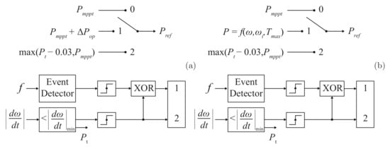 Both methods in [46,50] depend on fast power variation in the wind turbine, which might trigger another frequency deviation event during the transition from over- to underproduction modes (points C,D in Figure 6 and Figure 10). Consequently, alternative methods relying solely on rotor speed have been proposed to achieve a smoother power transition. In [52], a constant power reference is introduced alongside the MPPT reference in the overproduction mode, as depicted in the control scheme in Figure 11a. In this method, the overproduction power reference (mode 1) is the MPPT reference added to a constant value. This way, there is no need to save the power reference when the event is detected, as in the previous methods. However, for the underproduction mode, it is necessary to save the value of the reference power () during the transition between modes. In the second mode, the reference power is given by this transition power minus a small constant value.